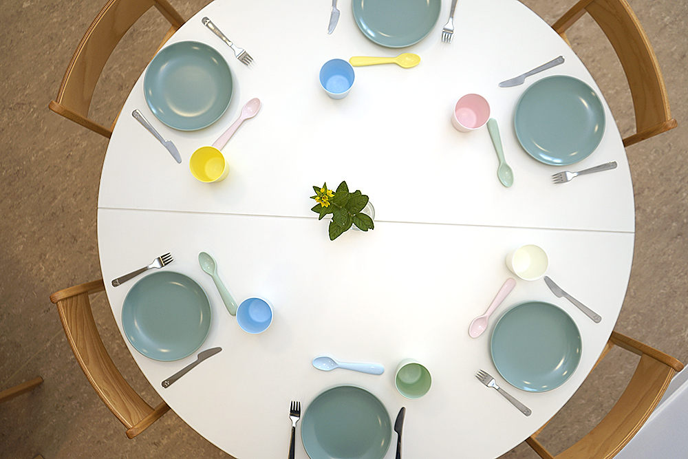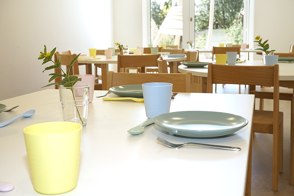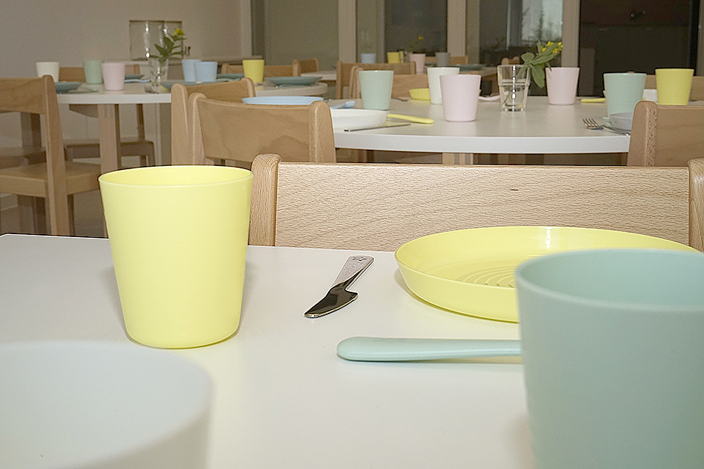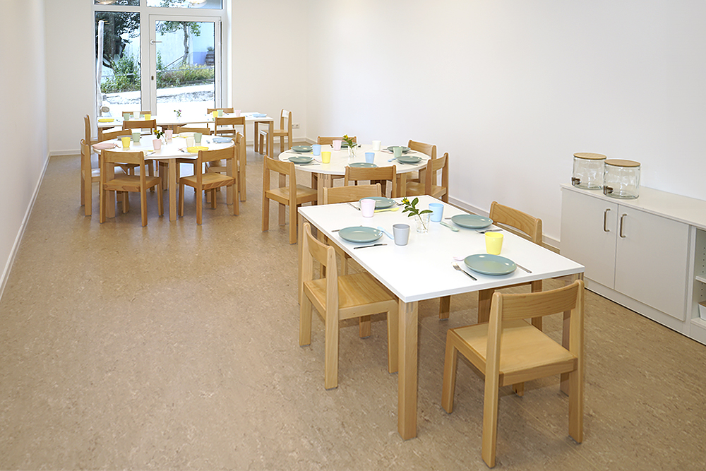 Das Essen findet bei uns im Speiseraum statt, bei einer gemeinsamen Brotzeit am Vormittag geben wir den Kindern die Möglichkeit selbsttätig zu agieren und fördern somit die Selbständigkeit.